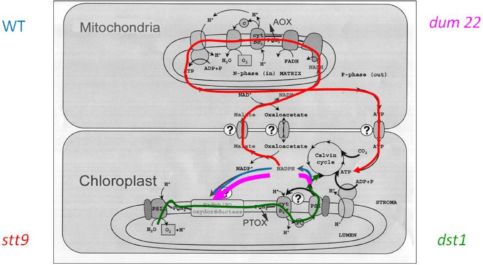 Sur la base de cette observation, nous avons décidé d'explorer le rôle des transitions d'état sur la photosynthèse de Chlamydomonas chez les mutants avec des défauts respiratoires. L'analyse de mutants respiratoires (dum22) et ou inhibés en transition d'état (stt7), ainsi que d'un double mutant affecté dans les deux processus (dst1) leur a permis de montrer le rôle essentiel de ce processus. En conditions où l'ATP supplémentaire ne peut pas être fournie par la respiration, l'augmentation du transfert d'électrons cyclique autour du PSI (liée aux transitions d'état) devient nécessaire pour l'activité photosynthétique (dum22). L'inhibition concomitante des transitions d'état et de la respiration (dst1) diminue le rendement global de la photosynthèse, conduisant finalement à une inhibition de croissance.