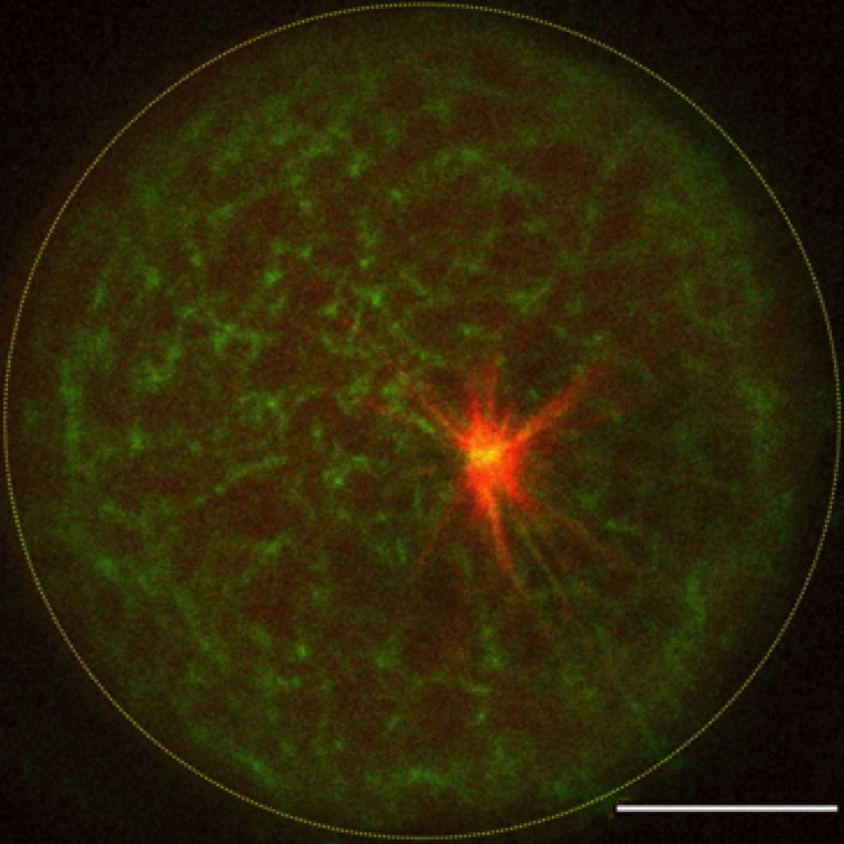 in vitro permet de s’affranchir de la complexité du milieu intracellulaire, et de découpler ainsi les interactions biochimiques des interactions mécaniques. L’utilisation conjointe de systèmes reconstitués à partir de protéines purifiées et d’extraits cellulaires de Xénope a permis d’identifier la façon dont un réseau d’actine contraint physiquement la croissance des fibres de microtubules. En effet, le réseau d’actine bloque la croissance des microtubules et déclenche leur désassemblage ce qui réduit à la fois leur longueur et leur vitesse de croissance. Ce même réseau d’actine peut limiter dans un milieu confiné le mouvement d’un aster de microtubules en agissant comme une matrice élastique. Enfin, si le réseau d’actine est suffisamment dense, il peut bloquer l’assemblage d’un fuseau méiotique.