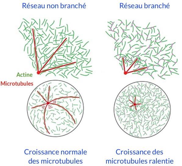 Le modèle retenu est que l’actine, et plus particulièrement un réseau d’actine réticulé, peut agir comme une barrière physique pouvant limiter la croissance des microtubules. La connectivité augmente la rigidité du réseau qui peut alors agir comme un obstacle à la croissance des microtubules. Ainsi c’est l’architecture de l’actine qui impose des contraintes mécaniques sur la croissance des microtubules. Les microtubules sont quant à eux capables de modifier localement la géométrie du réseau d’actine, en la réorganisant sous forme de structure astrale.