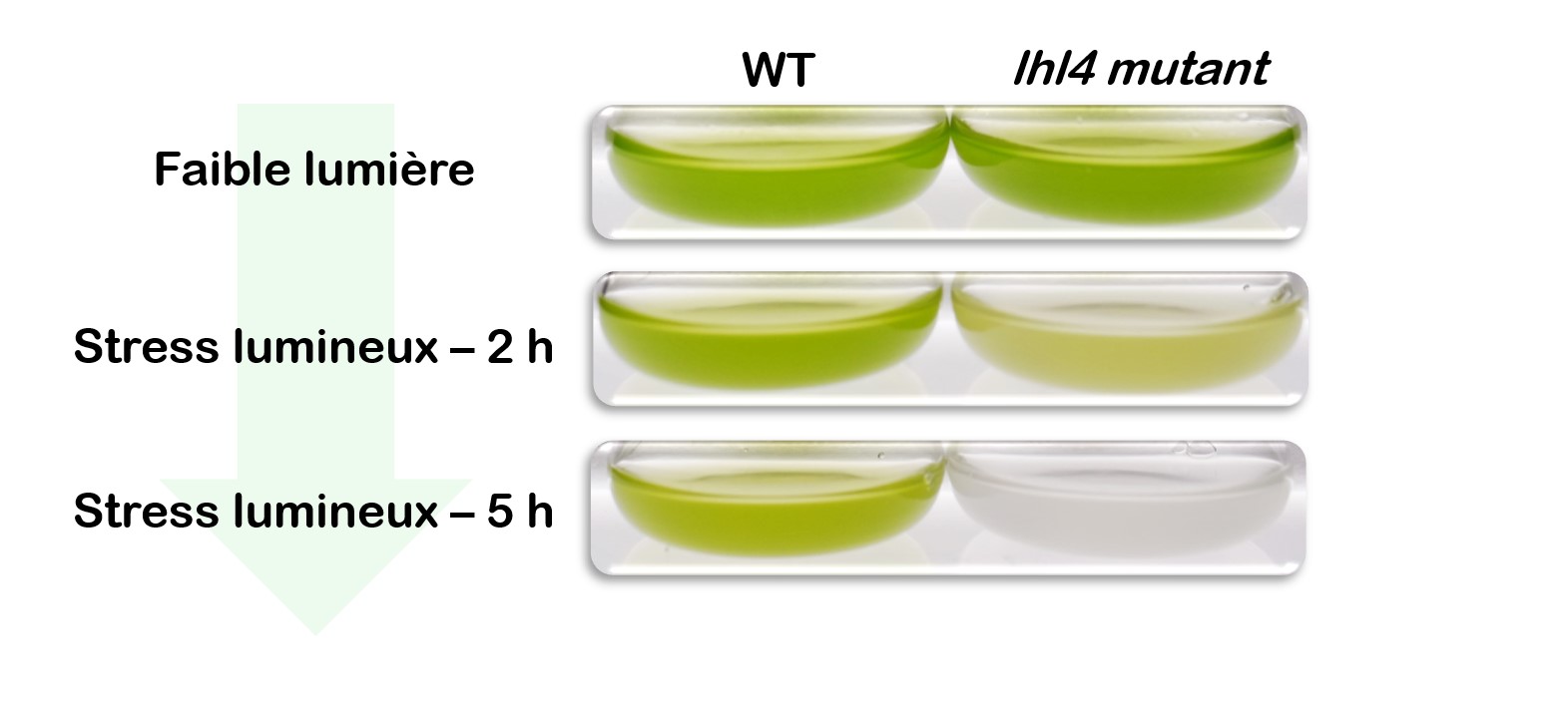 Photographie de cultures liquides des souches sauvage (WT) et mutante lhl4 de la microalgue Chlamydomonas reinhardtii. Sous faible lumière, les deux cultures présentent une coloration verte caractéristique. Cependant, en condition de stress lumineux, la souche lhl4 meurt rapidement, incapable d’activer des mécanismes de protection contre les dommages induits par la lumière. La culture devient alors progressivement transparente.