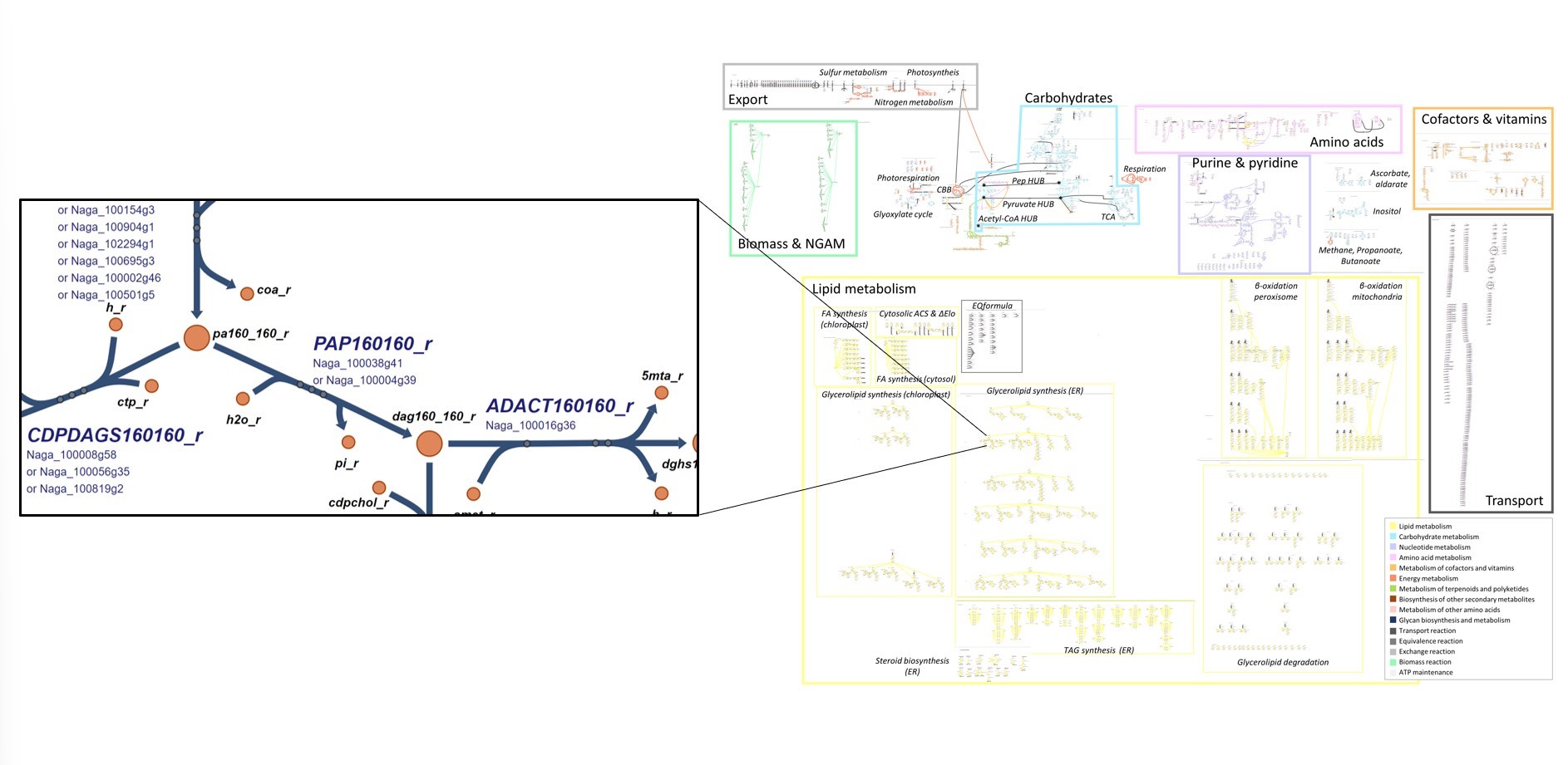 Microchloropsis gaditana avec un métabolisme lipidique complet et validé. Les voies métaboliques ont toutes été exhaustivement annotées et sont visualisables à partir d'une carte 2D ESCHER (https://escher.github.io).