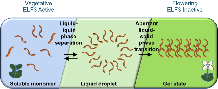 Nature, we show that ELF3 has a sequence related to prion proteins. Prions are proteins that occur in two states, a soluble form and a highly condensed multimeric state, and are most well known for being connected to diseases such as Huntington’s disease and bovine spongiform encephalopathy (“mad cow disease”). While prions were first identified for causing disease, proteins with prion-like sequences are very common and found across the kingdoms of life from fungi to plants and animals. We have found that the prion-related domain in the protein ELF3 acts as a reversible temperature switch. At lower temperatures, ELF3 is in the active state, repressing gene expression. As the temperature increases, the ELF3 prion-domain switches directly in response to temperature causing ELF3 to phase separate and form liquid droplets, inactivating the protein.